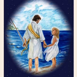 The Lord is My Shepherd Encouraging Card features a Print of a Watercolor Painting I did after a severe illness a few years ago. The card shows the Good Shepherd Jesus, His face strong and steady in the midst of a dark, blinding storm. His glowing clothes are billowing all about Him as He presses forward with nothing and no one able to stop Him or His purpose for the one He has charge over~the little one who is crouching close behind Him to escape the blast of the stormy tempest.